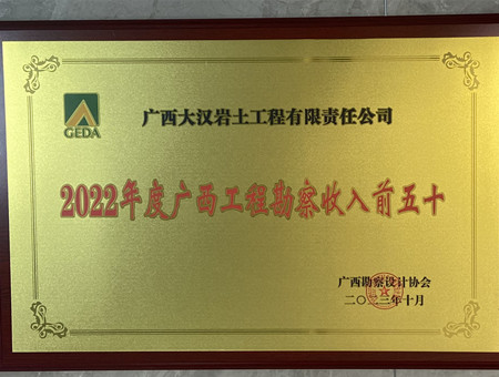 廣西大漢巖土工程有限責任公司榮獲“2022年度廣西工程勘察收入前五十”